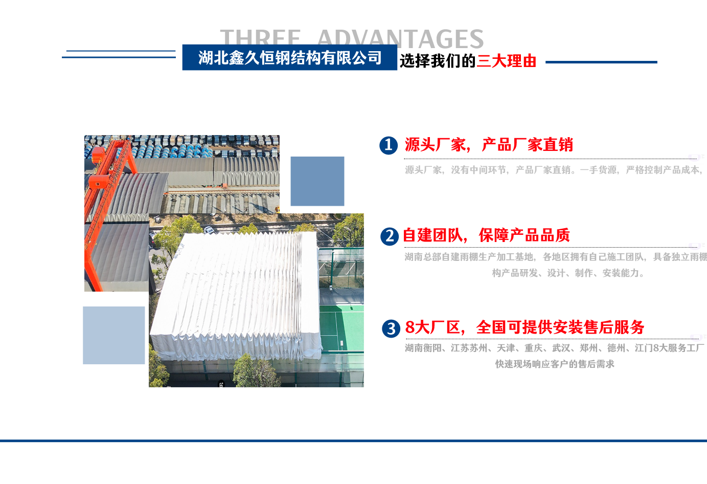 湖北鑫久恒鋼結構有限公司是一家電動雨棚、膜結構車棚研發,生產銷售,施工安裝于一體的專業鋼結構科技公司,主要產品有伸縮雨棚,電動雨棚,膜結構車棚等?! 『系貐^職員目前有80多人,占地面積20000平方米,廠房面積15600平方米,配備先進的生產流水線,使每件品質產品的堅實基礎?! 」驹谔K州、天津、重慶、武漢、德州、烏魯木齊、江門均設有服務工廠,總人員共300多人,擁有專業的技術團隊,配備先進的設備和流水線生產,產能高,貨源充足,發貨速度快,服務區域廣?! ∫苿由炜s棚適用于通道臨時倉儲、戶外運動遮陽、污水池遮蓋、能源交通、熱力化工、礦山、船舶制造及市政建設、物流、碼頭等領域的構件制作加工,成品半成品存放、倉庫、野外儀器設備操作用房等。尤其是對工廠發貨、倉儲臨時遮雨防嗮,梅雨期較長、建設周期較短的工程施工等特別適用。還可根據用戶需求量身定制、適合企業所需不同款式的產品。  我公司堅持“誠信社會為本,客戶滿意為榮”的經營理念,做到質量把控,嚴格管理,精益求精,恪守承諾。使鑫久恒逐步走向成熟,其系統化、專業化日趨完善。以專業的技術、科學的管理,更高的產品質量,優良的企業信譽,真誠的客戶服務,靈活多樣的經營方式和務實創新的企業精神愿與社會各界攜手合作,為推動智能鋼結構建筑事業的發展而不斷努力。...